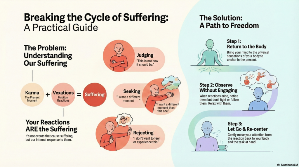 When suffering arises, our habitual reactions of judging, seeking, and rejecting intensify the pain. David explains that suffering is not caused by circumstances themselves, but by how the mind reacts to the present. Rather than trying to suppress these reactions, practice invites us to become aware of them and gently disengage—letting them arise, letting them be, and letting them go.